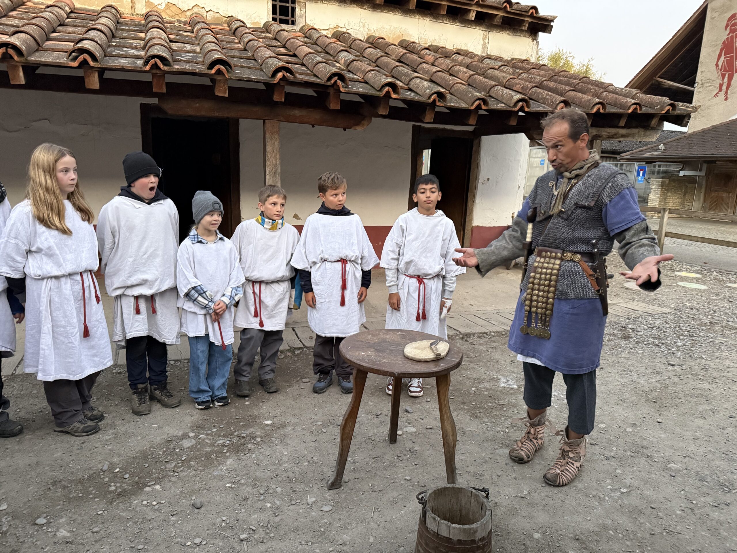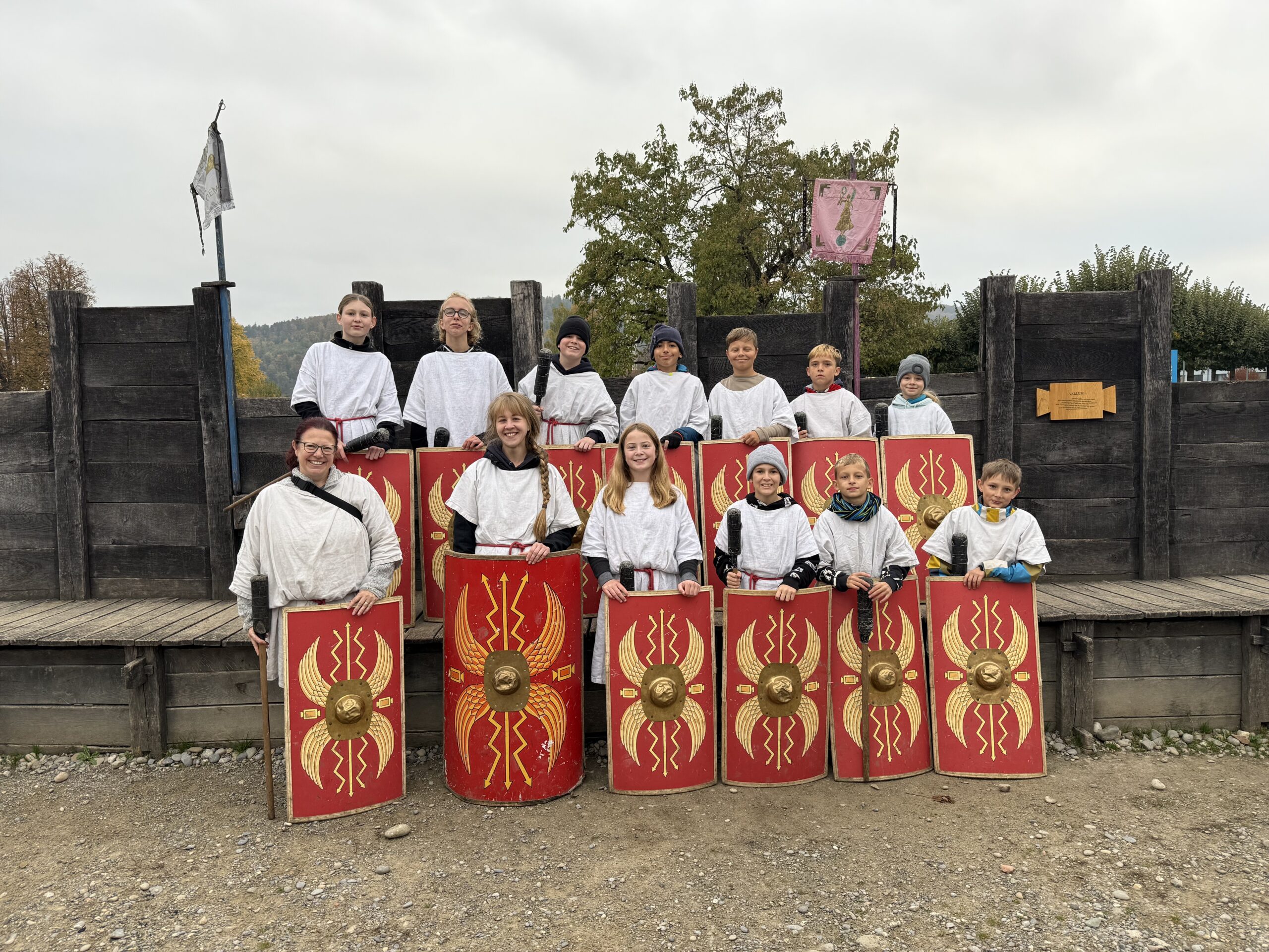 Am Morgen machten wir eine tolle Spieletour mit Audio-Guides. Die Stimmen erzählten spannende Geschichten aus dem alten Rom, und wir mussten Aufgaben lösen und Hinweise finden. Danach assen wir unseren mitgebrachten Lunch. Dann ging es weiter ins Römermuseum nach Brugg. Dort lösten wir archäologische Rätsel und entdeckten alte Münzen, Helme und Töpfe. Wir konnten uns richtig vorstellen, wie die Römer früher gelebt haben.