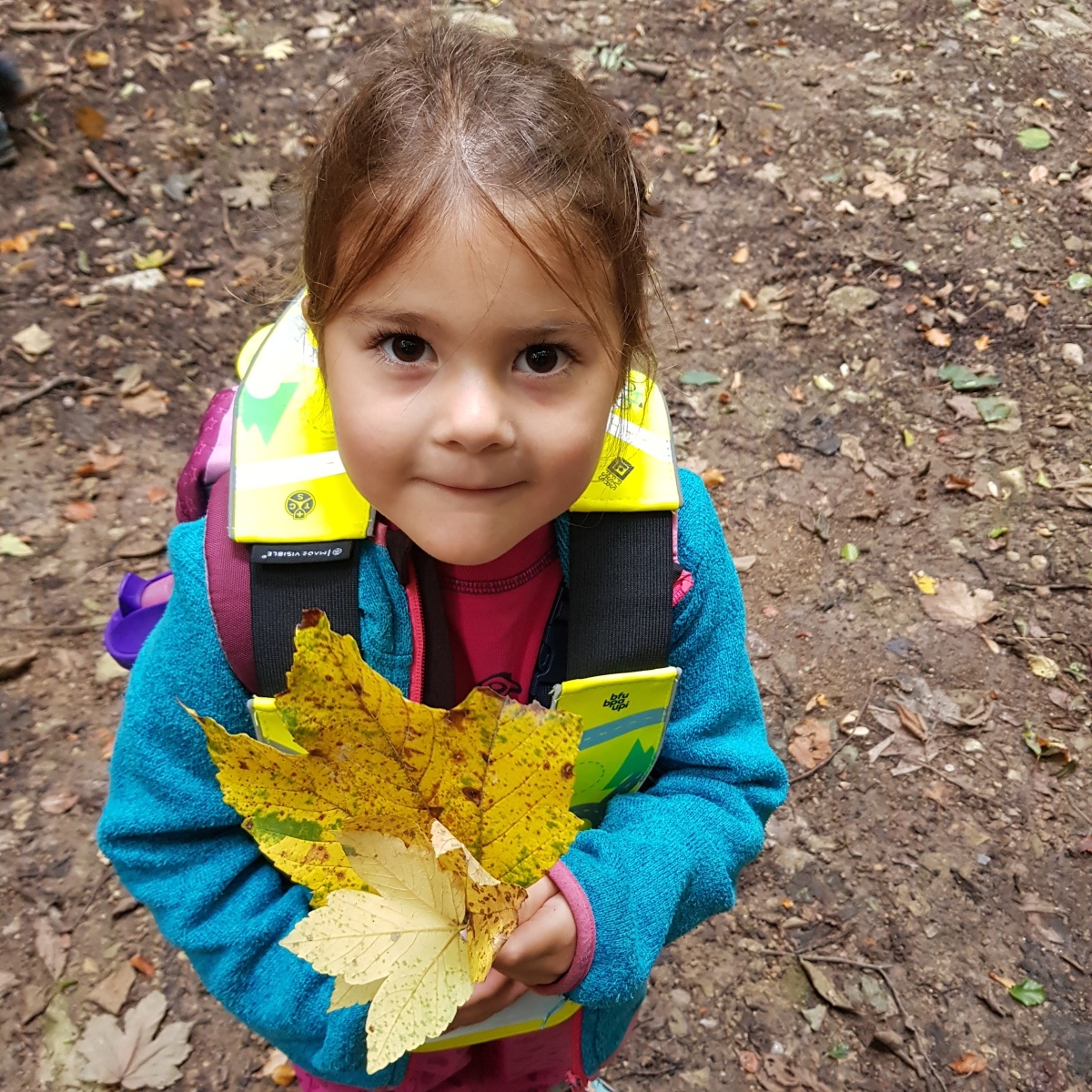 Herbstwanderung mit der ganzen Schule! Die Aufregung war gross und wir haben uns alle sehr auf diesen Tag gefreut. Um 9.00 Uhr sind wir in Richtung unseres Waldplatzes losmarschiert, dann aber statt rechts abgebogen weiter in den Wald hinaufgelaufen. Der Weg war ganz schön steil, aber wir haben immer wieder angehalten, weil es viel Spannendes zu entdecken gab. Wir haben ein Eichhörnchen gesehen und einen Baumstrunk, wo ganz viele kleine Tiere ihre Spuren hinterlassen haben. Auch bei einem kleinen Wasserfall sind wir vorbei gekommen und mussten da natürlich schauen, wer den grössten Stein ins Wasser werfen kann. Ein Stück weiter haben wir viele Bucheckern gefunden und sie ausgiebig probiert.  Beim Znüniplatz gab es einen Hochsitz für Jäger und alle Kinder haben sich getraut, die vielen Tritte hochzuklettern und die Aussicht zu geniessen. Beim Mittagessen haben wir dann die Schulkinder getroffen und konnten mit ihnen spielen. Dazu gab es einen warmen Tee, der uns allen sehr geschmeckt hat.