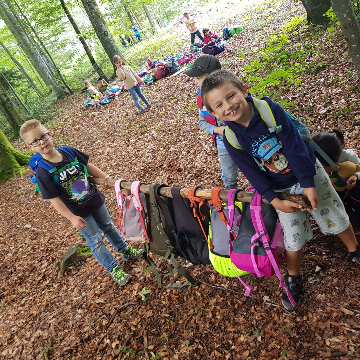 Herbstwanderung mit der ganzen Schule! Die Aufregung war gross und wir haben uns alle sehr auf diesen Tag gefreut. Um 9.00 Uhr sind wir in Richtung unseres Waldplatzes losmarschiert, dann aber statt rechts abgebogen weiter in den Wald hinaufgelaufen. Der Weg war ganz schön steil, aber wir haben immer wieder angehalten, weil es viel Spannendes zu entdecken gab. Wir haben ein Eichhörnchen gesehen und einen Baumstrunk, wo ganz viele kleine Tiere ihre Spuren hinterlassen haben. Auch bei einem kleinen Wasserfall sind wir vorbei gekommen und mussten da natürlich schauen, wer den grössten Stein ins Wasser werfen kann. Ein Stück weiter haben wir viele Bucheckern gefunden und sie ausgiebig probiert.  Beim Znüniplatz gab es einen Hochsitz für Jäger und alle Kinder haben sich getraut, die vielen Tritte hochzuklettern und die Aussicht zu geniessen. Beim Mittagessen haben wir dann die Schulkinder getroffen und konnten mit ihnen spielen. Dazu gab es einen warmen Tee, der uns allen sehr geschmeckt hat.
