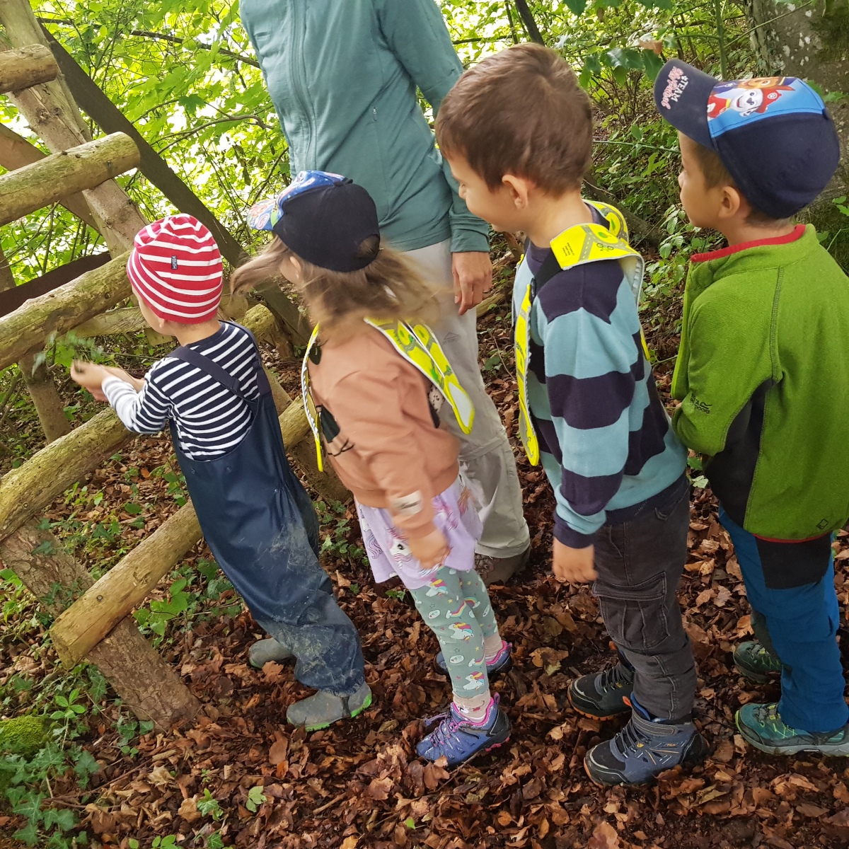 Herbstwanderung mit der ganzen Schule! Die Aufregung war gross und wir haben uns alle sehr auf diesen Tag gefreut. Um 9.00 Uhr sind wir in Richtung unseres Waldplatzes losmarschiert, dann aber statt rechts abgebogen weiter in den Wald hinaufgelaufen. Der Weg war ganz schön steil, aber wir haben immer wieder angehalten, weil es viel Spannendes zu entdecken gab. Wir haben ein Eichhörnchen gesehen und einen Baumstrunk, wo ganz viele kleine Tiere ihre Spuren hinterlassen haben. Auch bei einem kleinen Wasserfall sind wir vorbei gekommen und mussten da natürlich schauen, wer den grössten Stein ins Wasser werfen kann. Ein Stück weiter haben wir viele Bucheckern gefunden und sie ausgiebig probiert.  Beim Znüniplatz gab es einen Hochsitz für Jäger und alle Kinder haben sich getraut, die vielen Tritte hochzuklettern und die Aussicht zu geniessen. Beim Mittagessen haben wir dann die Schulkinder getroffen und konnten mit ihnen spielen. Dazu gab es einen warmen Tee, der uns allen sehr geschmeckt hat.