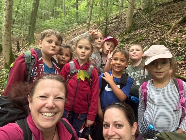 Herbstwanderung mit der ganzen Schule! Die Aufregung war gross und wir haben uns alle sehr auf diesen Tag gefreut. Um 9.00 Uhr sind wir in Richtung unseres Waldplatzes losmarschiert, dann aber statt rechts abgebogen weiter in den Wald hinaufgelaufen. Der Weg war ganz schön steil, aber wir haben immer wieder angehalten, weil es viel Spannendes zu entdecken gab. Wir haben ein Eichhörnchen gesehen und einen Baumstrunk, wo ganz viele kleine Tiere ihre Spuren hinterlassen haben. Auch bei einem kleinen Wasserfall sind wir vorbei gekommen und mussten da natürlich schauen, wer den grössten Stein ins Wasser werfen kann. Ein Stück weiter haben wir viele Bucheckern gefunden und sie ausgiebig probiert. Beim Znüniplatz gab es einen Hochsitz für Jäger und alle Kinder haben sich getraut, die vielen Tritte hochzuklettern und die Aussicht zu geniessen. Beim Mittagessen haben wir dann die Schulkinder getroffen und konnten mit ihnen spielen. Dazu gab es einen warmen Tee, der uns allen sehr geschmeckt hat.