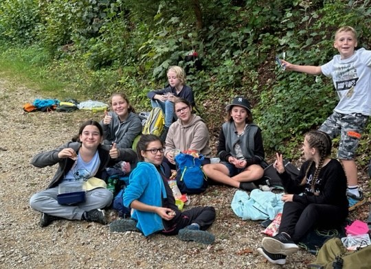 Nach dieser erholsamen Pause waren wir bereit, die steile Wanderung fortzusetzen. Der Weg führte uns durch dichte Wälder und über grüne Wiesen. Nachdem wir als letzte Gruppe am Picknickort angekommen waren, schlossen wir uns den anderen Kindern und Lehrpersonen an. Wir genossen ein leckeres Mittagessen und verbrachten die Zeit danach mit fröhlichen Spielen.