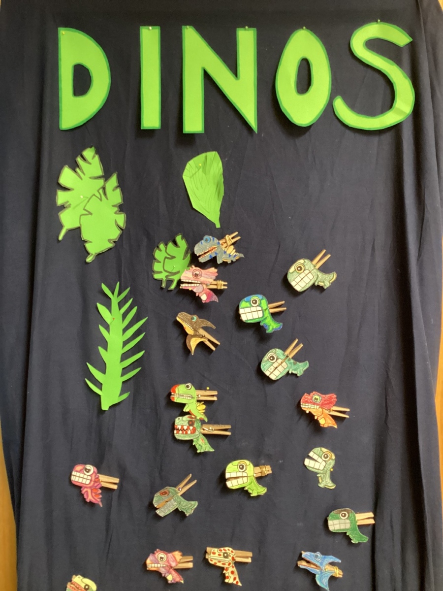 Die 2. und 3. Klasse nahm die Besucher mit zu den Dinos. Umrahmt von grossen gemalten Dinos sangen sie ein Lied zu den kraftvollen Sauriern.