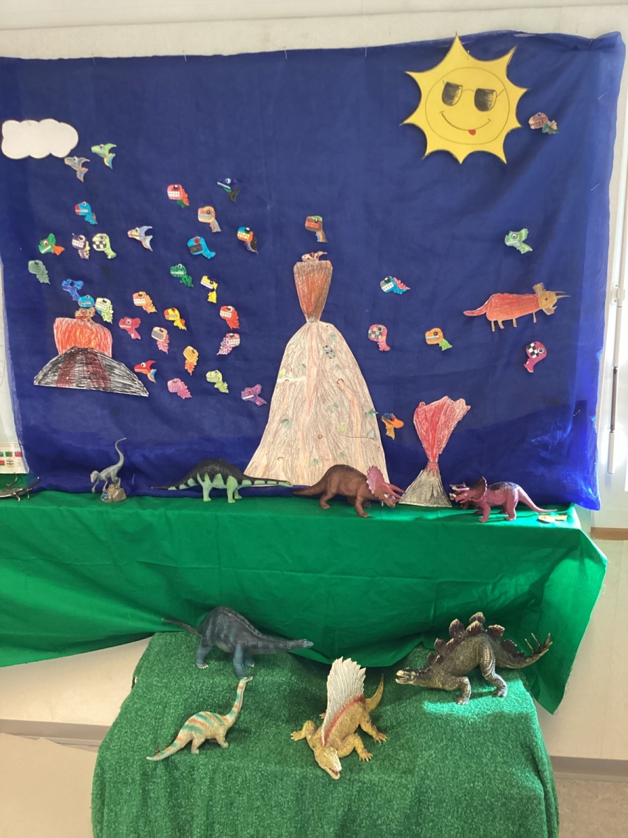 Die 2. und 3. Klasse nahm die Besucher mit zu den Dinos. Umrahmt von grossen gemalten Dinos sangen sie ein Lied zu den kraftvollen Sauriern.