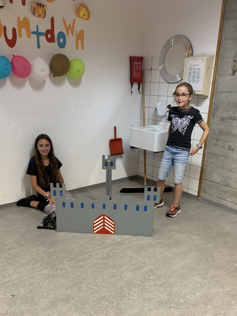 Nach all diesen tollen Darbietungen war es aber noch nicht vorbei. In den Klassenzimmern haben die Schülerinnen und Schüler mit ihren Klassenlehrerinnen Workshops vorbereitet. So konnte man danach noch Badesalz oder Schiffchen basteln. Dinos in verschiedenen Varianten bastelt oder sich bei der Fotowand von einem fressen lassen. Katapulte schiessen oder Kegeln wie bei den Galliern. Oder sich Schlümpfe auf die Haut zeichnen lassen und sein Schlumpfwissen auf die Probe stellen.