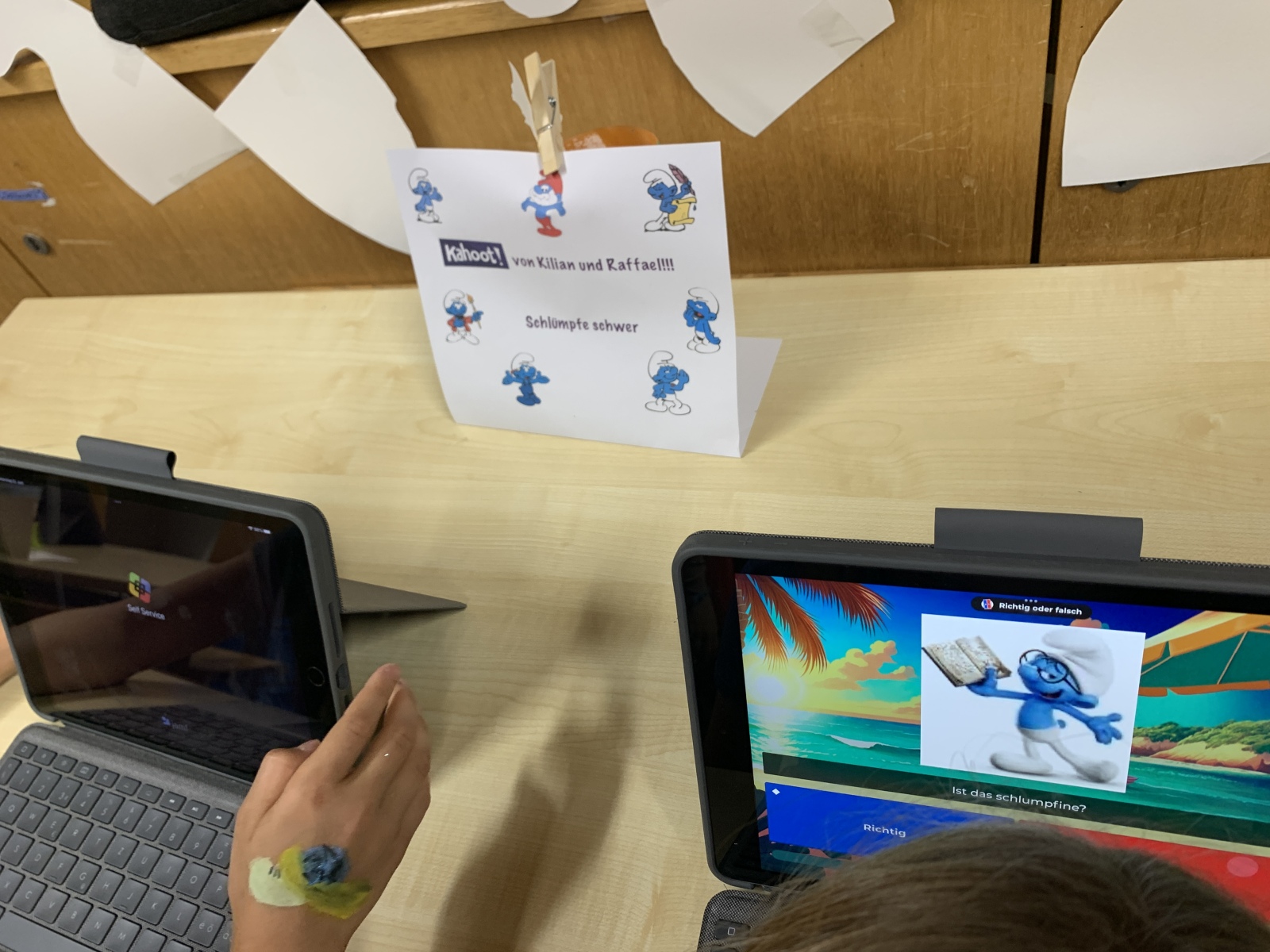 Nach all diesen tollen Darbietungen war es aber noch nicht vorbei. In den Klassenzimmern haben die Schülerinnen und Schüler mit ihren Klassenlehrerinnen Workshops vorbereitet. So konnte man danach noch Badesalz oder Schiffchen basteln. Dinos in verschiedenen Varianten bastelt oder sich bei der Fotowand von einem fressen lassen. Katapulte schiessen oder Kegeln wie bei den Galliern. Oder sich Schlümpfe auf die Haut zeichnen lassen und sein Schlumpfwissen auf die Probe stellen.